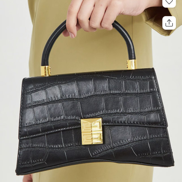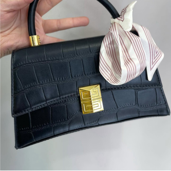 Crafted with an elegant crocodile-embossed finish, this structured handbag exudes premium appeal. The sleek black body is beautifully complemented by gold-tone hardware and a signature statement lock, giving it a refined and polished look.