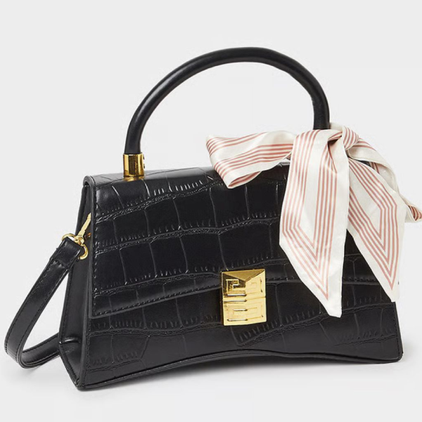 Make a bold and powerful statement with this Black Croc-Texture Top Handle Handbag, designed for women who appreciate timeless luxury and sophistication.