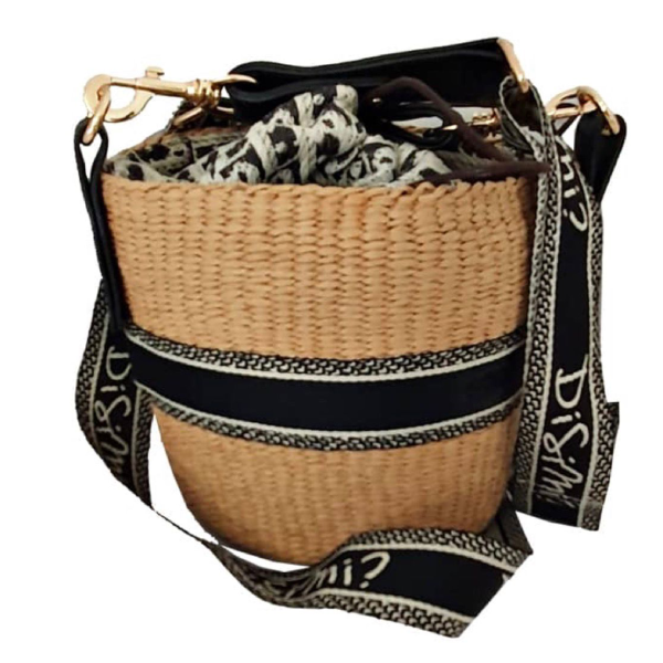 The combination of natural woven texture and black accent strap makes it versatile for both casual and semi-formal outfits.