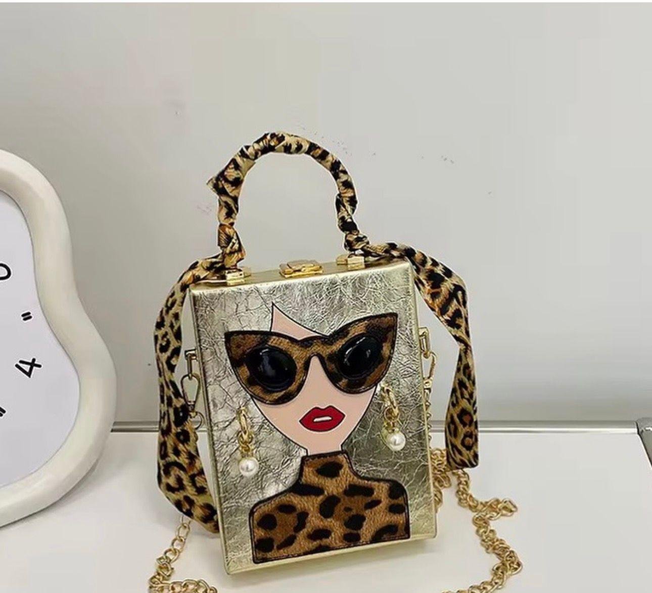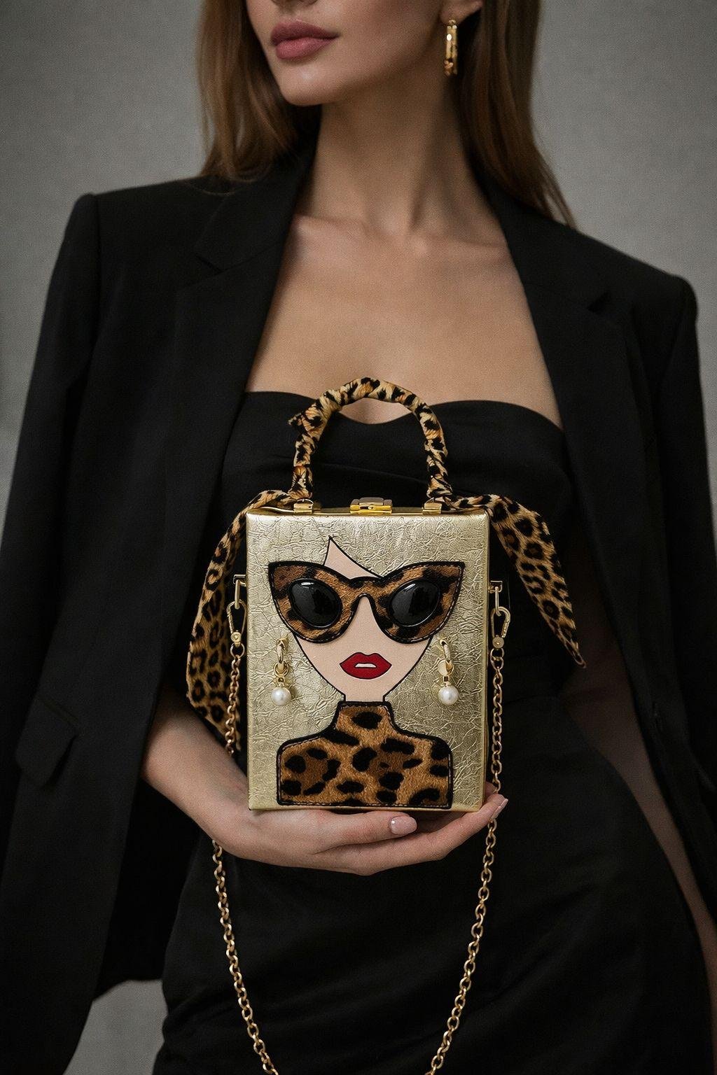 Add a bold and stylish touch to your outfit with this Leopard Print Fashionista Mini Box Bag. This trendy designer bag features a stunning metallic gold finish with a fashionable lady illustration wearing leopard sunglasses and pearl earrings.